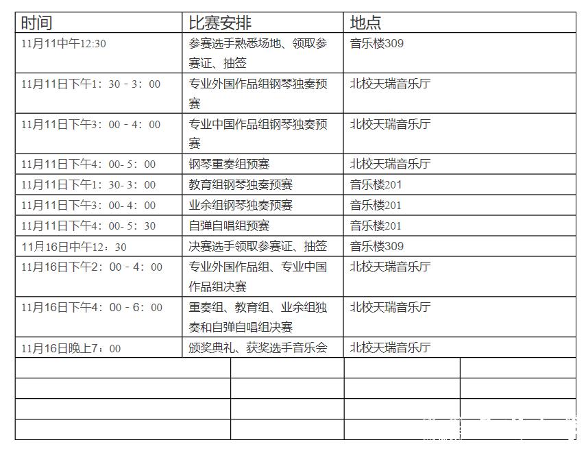 本次比赛分预赛和决赛,比赛形式是钢琴独奏,钢琴重奏(四手联弹、双钢琴等),自弹自唱,不设规定曲目,自选作品一首,限时3-12分钟左右,预赛和决赛可弹奏同一作品(专业组决赛时要求加弹一首指定曲目,谱子和音响资料可在彩票平台