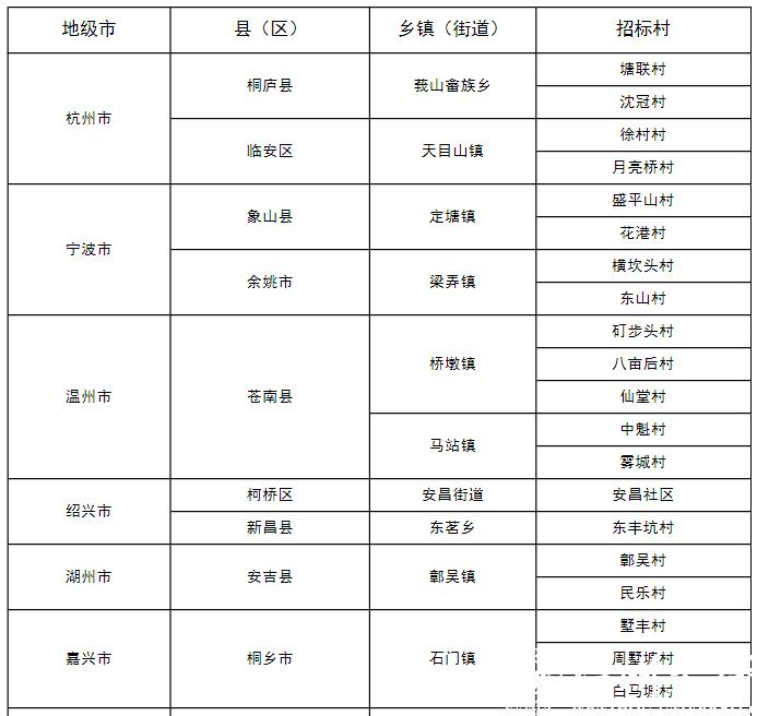 本届大赛合作基地乡镇因分布地域不同,在自然风貌、资源禀赋、人文社会环境和发展水平上都具有典型性和特殊性,能比较全面地展现浙江省乡村的经济社会发展情况,为竞赛团队提供丰富的选题素材,有利于拓展大学生的研究视野,便于各参赛团队发挥专业所长为乡村振兴贡献智慧。具体竞赛合作基地乡镇及招标村名单如下: