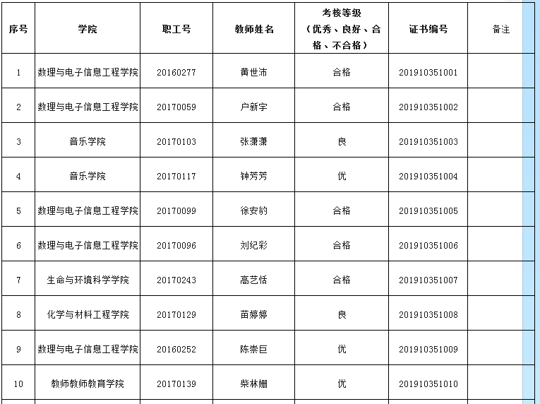 根据《温州大学青年教师助讲培养实施办法(试行)》(温大行政〔2013〕115号),学校于近期组织开展了2019年1月份青年教师助讲培养考核工作,数理与电子信息工程学院黄世沛等16位教师通过考核,现将具体考核结果公布如下: