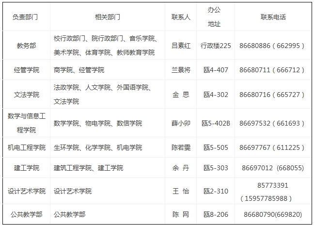2018年11月8日—11月18日,公选课开设申请表及教学大纲请各申请教师于11月19日前上交瓯江学院相关部门,各相关部门负责人于11月20日前统一交至教务部吕素红处(瓯江行政楼225,662995)。