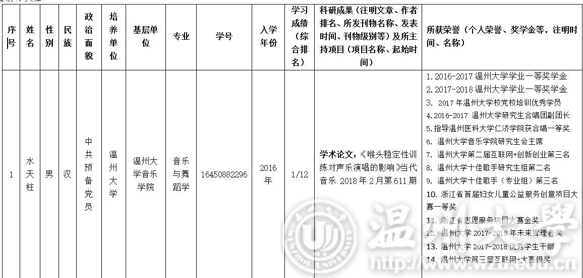 按照《普通高等学校研究生国家奖学金评审办法》教财[2014]1号、《温州大学研究生国家奖学金管理办法(试行)》[(2013)159号]和《彩票平台-彩票平台排行榜 研究生国家奖学金评定细则》[行政〔2014〕9号]等文件精神,经过自主申请、资格审查、研究生国家奖学金评审委员会评选等环节,拟推荐的名单予以公示如下:16音研水天柱