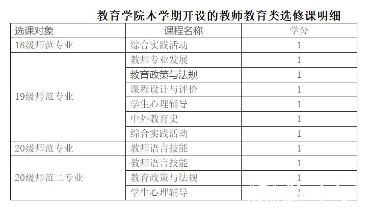 根据温州大学师范类专业本科人才培养方案要求,师范生需修读教师教育类选修课,其中18级需修满6学分,19级、20级学生对需修满3学分(具体以各自专业的培养方案为准)。该类课程设置分为教育学院面向全校师范专业统一选课开设及学生所在学院专业内独立选课开设两类。现开展教育学院面向师范专业开设教师教育类选修课选课工作,具体如下: